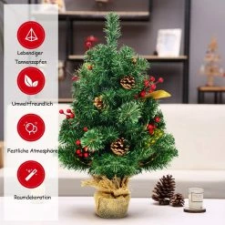 Suchen Sie nach ein paar Mini Weihnachtsbäumen als Ergänzung für Ihre Weihnachtsdekoration? Dieser künstliche miniatur- Weihnachtsbaum misst lediglich 60 cm und ist somit perfekt geeignet, um Ihren Raum, den Tisch, das Büro oder jeden anderen, Ort mit wenig Platz aufzuhellen. Entworfen in einer schlichten, grüne Farbe und reichhaltigen Beeren, Blättern und lebhaften Kiefernzapfen erweckt er das Gefühl eines echten Weihnachtsbaumes. Der klassische Weihnachtsbaum ist mit einer Zementbasis ausgestattet, die die allgemeine Stabilität garantiert. Es ist kein Aufbau vonnöten und alles, was Sie tun müssen, ist Ihre Lieblingsdekorationen am Baum aufzuhängen. Lassen Sie diesen Weihnachtsbaum etwas festliche Freude in Ihr Zuhause bringen!