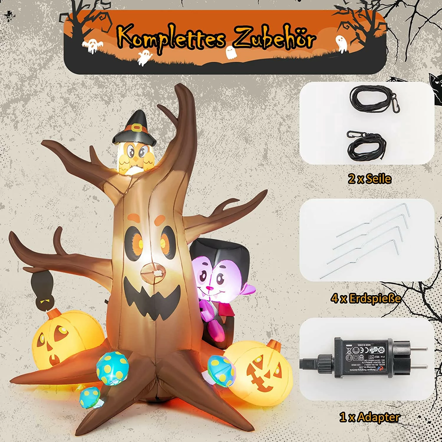 - Lieferumfang: 1 x aufblasbarer Toter Baum;4 x Bodenpfähle;2 x Seile;1 x Adapter