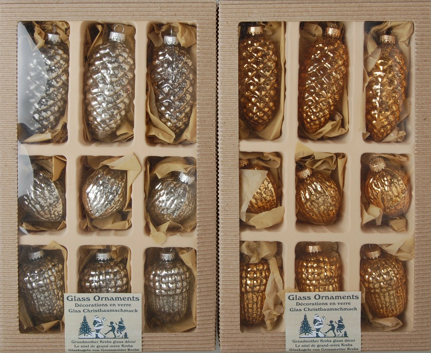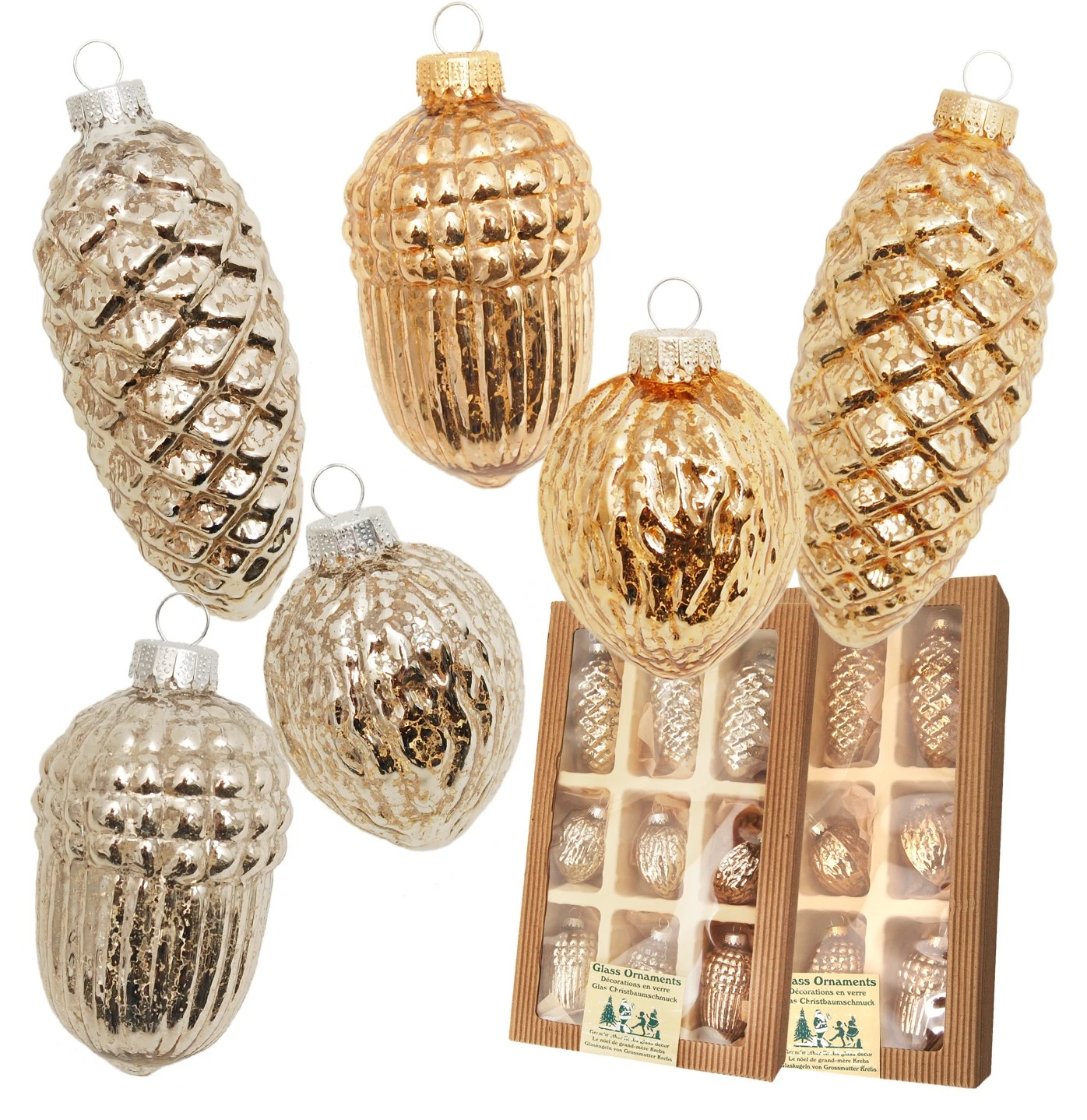 - Lieferumfang: Silber/Gold 6-10cm Zapfen/Eichel/Walnuss-Sortiment Mercury-Glas, 9-fach, mundgeblasen, handdekoriert