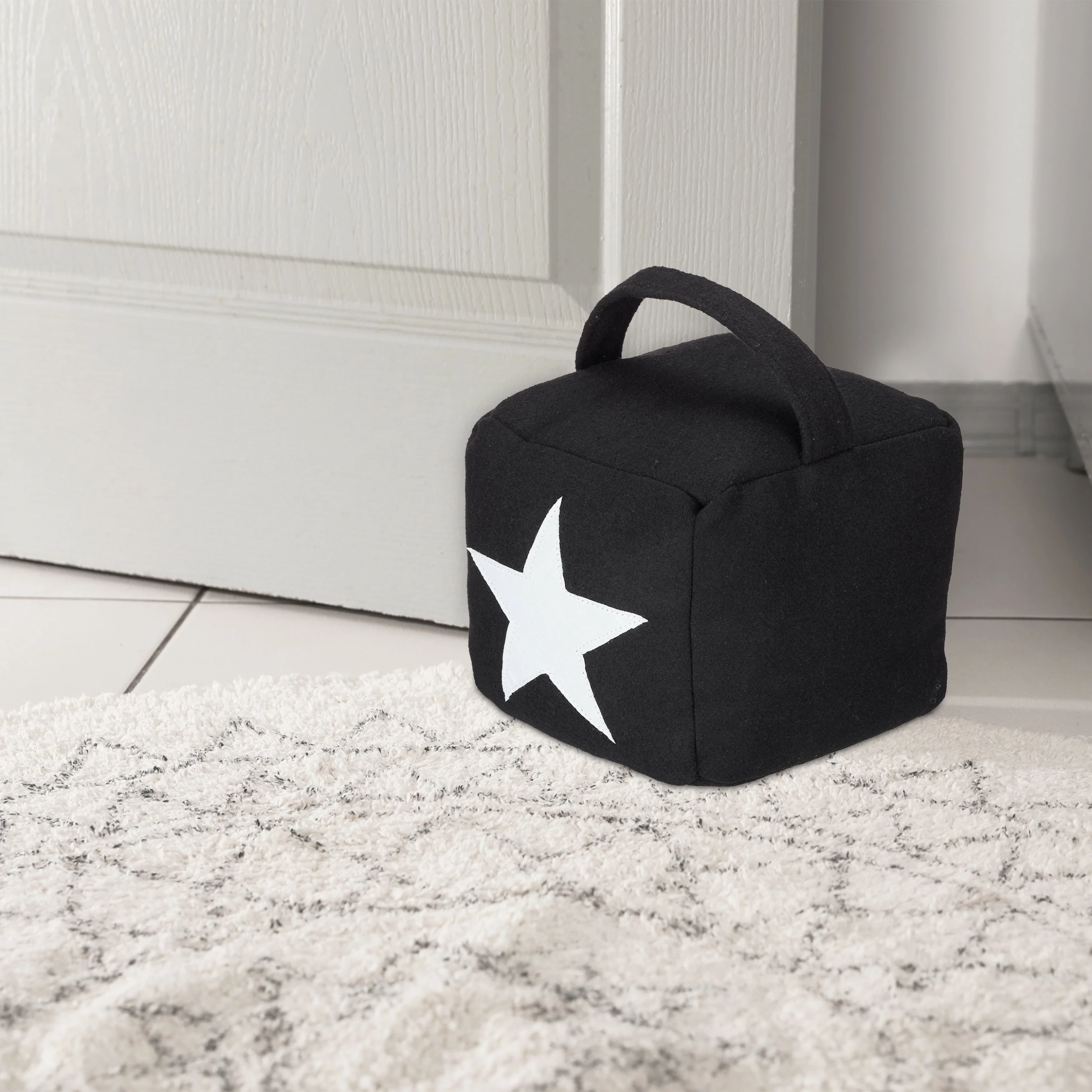 Der quadratische Türstopper aus Stoff überzeugt durch sein modernes Design mit einem dekorativen Stern auf der Vorderseite. Der Türpuffer muss nicht am Boden oder der Wand befestigt werden und kann durch den praktischen Griff einfach angehoben und jederzeit flexibel neu platziert werden.